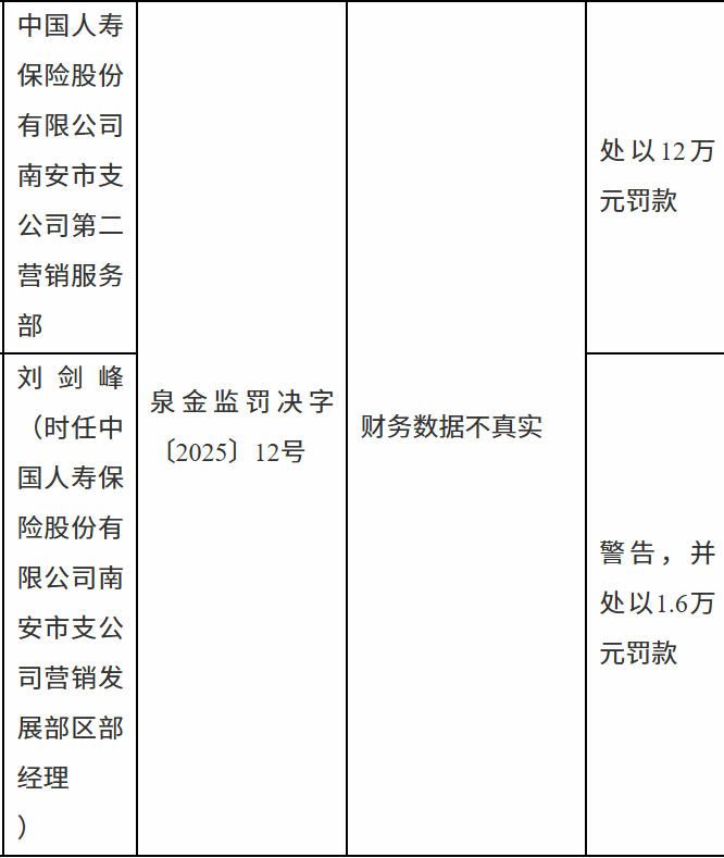 11月25日,泉州金融监管分局行政处罚信息公示表显示,中国人寿保险股份有限公司南安市支公司第二营销服务部因财务数据不真实被罚款12万元;刘某峰被警告并罚款1.6万元。